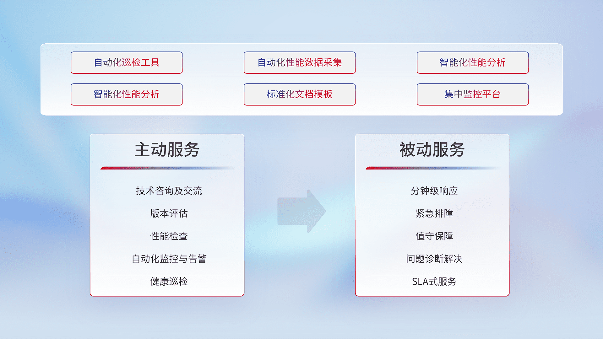 智能化工具和标准化文档,,保障服务质量,,,,提供主动服务(包含技术咨询、、版本评估、、、、性能检查、、、、自动化监控与告警、、、、健康巡检)和被动服务包含(分钟级响应、、紧急排障、、值守保障、、、、问题诊断解决、、、SLA服务)。。。。