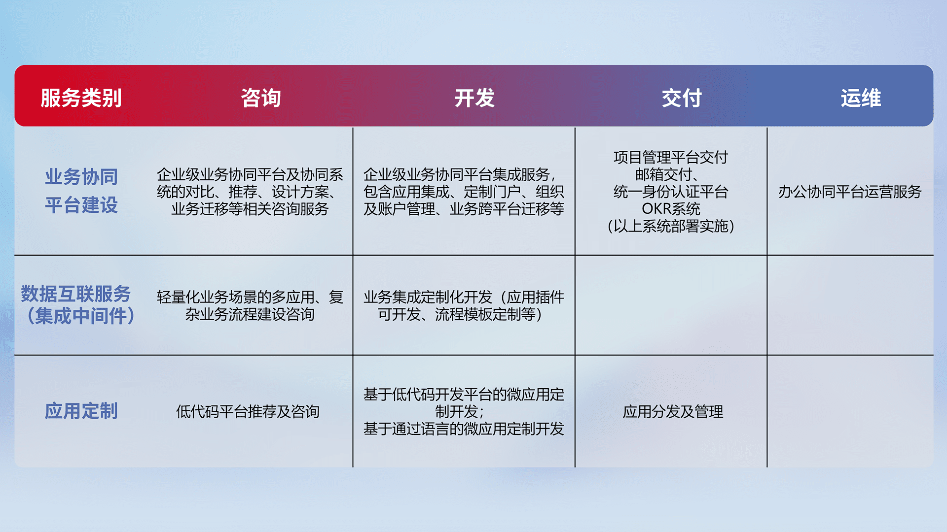 针对钉钉、、、企微、、、IDaas等平台级产品提供产品的规划、、、方案、、、交付、、、定制化开发等服务,,,实现如统一协同办公、、、智能客户服务、、、、混合会议管理、、、、智能数据查询、、等业务场景,,实现数字化转型。。